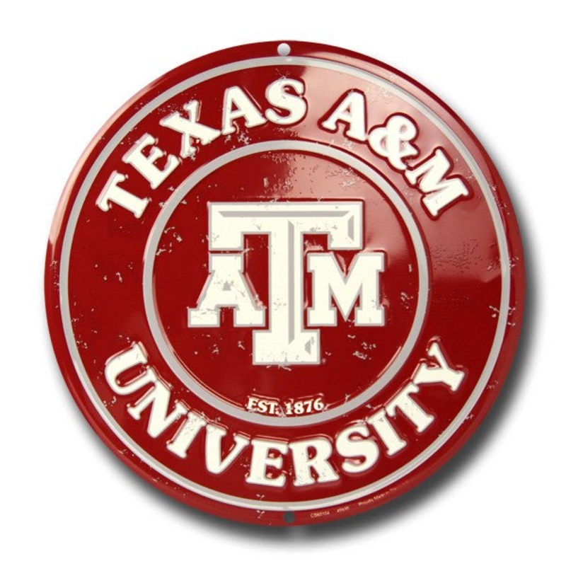 Officially licensed 12" Texas A&M Collegiate Embossed Metal Circular Sign. Made of high quality aluminum for a weather resistant finish. This sign has a weathered/vintage look. It is lightweight & durable. Pre-drilled holes for quick and easy mounting.