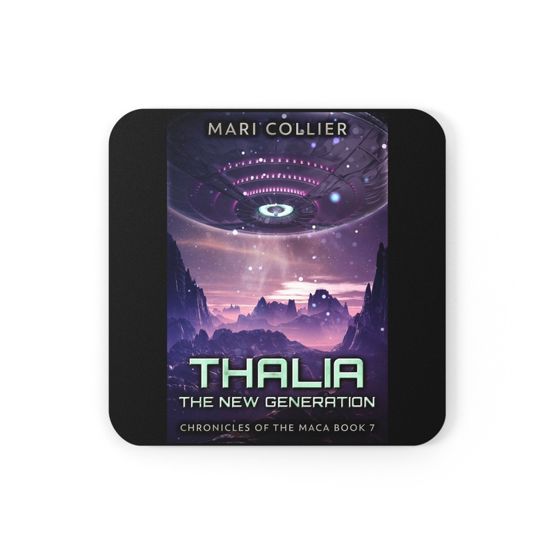 These coasters are made with a high-gloss top and feature a cork back to prevent sliding, and each order comes with a set of four coasters. The cover art in these coasters is from Mari Collier’s book, Thalia – The New Generation.