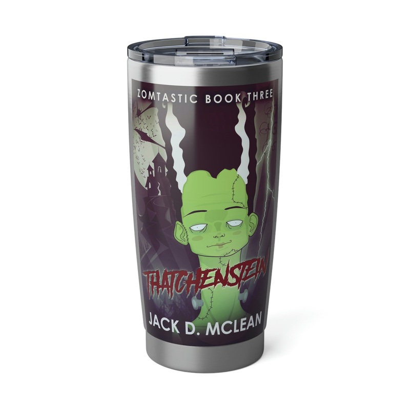 Minimize your plastic footprint with style. This tumbler fits perfectly into car cup holders, and the rubber gasket makes it spill-resistant on bumpier roads. The double-wall insulation makes sure drinks stay at the right temperature until the next pit stop. The cover art in this 20 oz tumbler is from Jack D. McLean’s book, Thatchenstein.