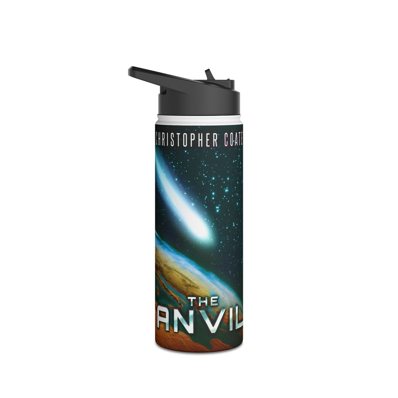 Quench your thirst in style with this 18oz stainless steel water bottle featuring a double-wall stainless steel build that keeps your drinks frosty for 24h and soothingly hot for 12h. This BPA-free, steel water bottle comes with a twist-on lid for easy sipping, making it excellent for daily use at work, at college, in the car, and beyond. The cover art in this water bottle is from Christopher Coates’s book, The Anvil.