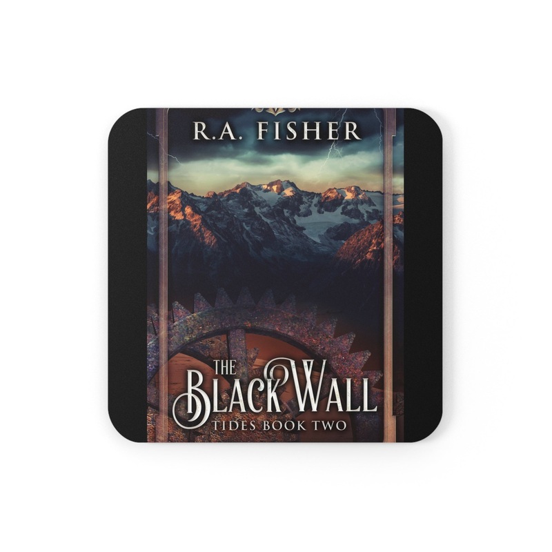 These coasters are made with a high-gloss top and feature a cork back to prevent sliding, and each order comes with a set of four coasters. The cover art in these coasters is from R.A. Fisher’s book, The Black Wall.
