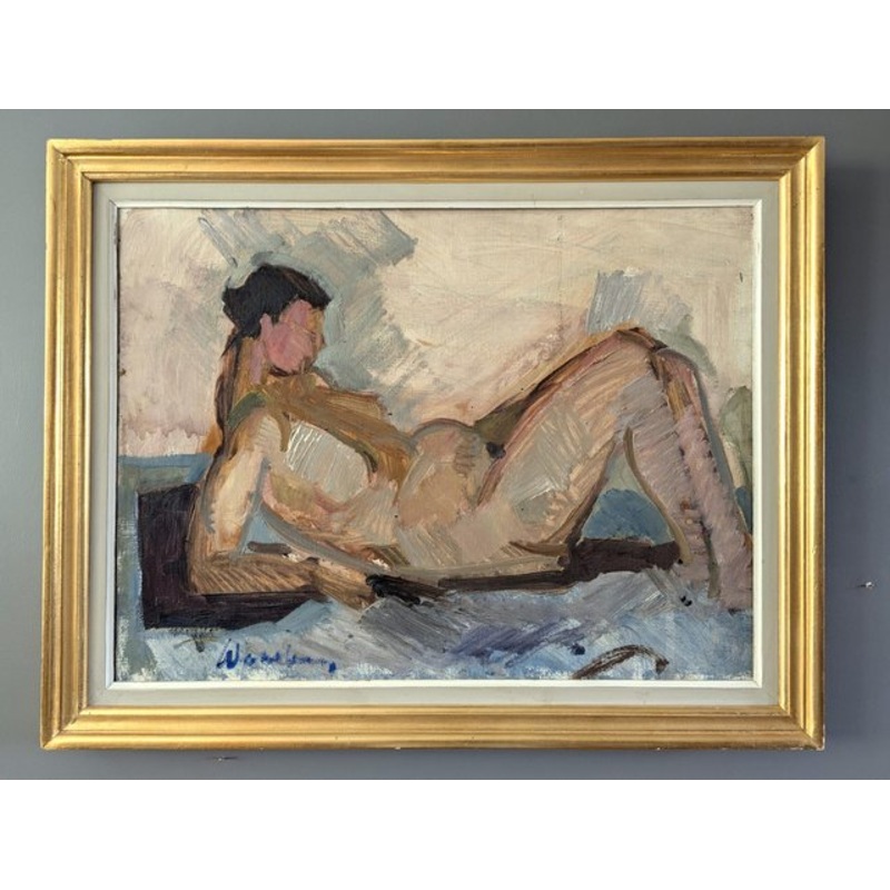 A brilliantly executed and emotive mid-century modernist figurative portrait of a reclining pregnant nude figure in a relaxed yet expressive pose, executed in oil onto canvas. The subjects form is simplified and abstracted, rendered in warm, earthy tones with gestural brushstrokes that emphasise movement and texture. The artist has used a loose, expressive technique with visible, confident brushwork, creating a sense of raw energy. The muted palette consists of beige, brown, and soft blues, harmonising the composition while highlighting the play of light and shadow across the figure. The background remains abstract, with atmospheric swathes of paint suggesting an interior space without rigid definition. Overall, the dynamic lines, swift and energetic brushwork, and emotive colour application contribute to an evocative portrayal of maternity and the female form. This oil on canvas is housed in a complementary gilt frame with an inner cream border. The painting is in excellent vintage condition, and the frame has scuffing. Size: 55.5 x 70.5 cm (including frame)
