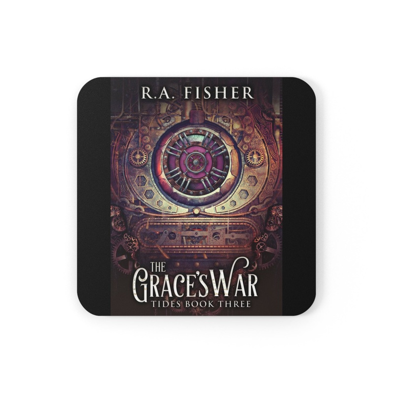 These coasters are made with a high-gloss top and feature a cork back to prevent sliding, and each order comes with a set of four coasters. The cover art in these coasters is from R.A. Fisher’s book, The Grace’s War.