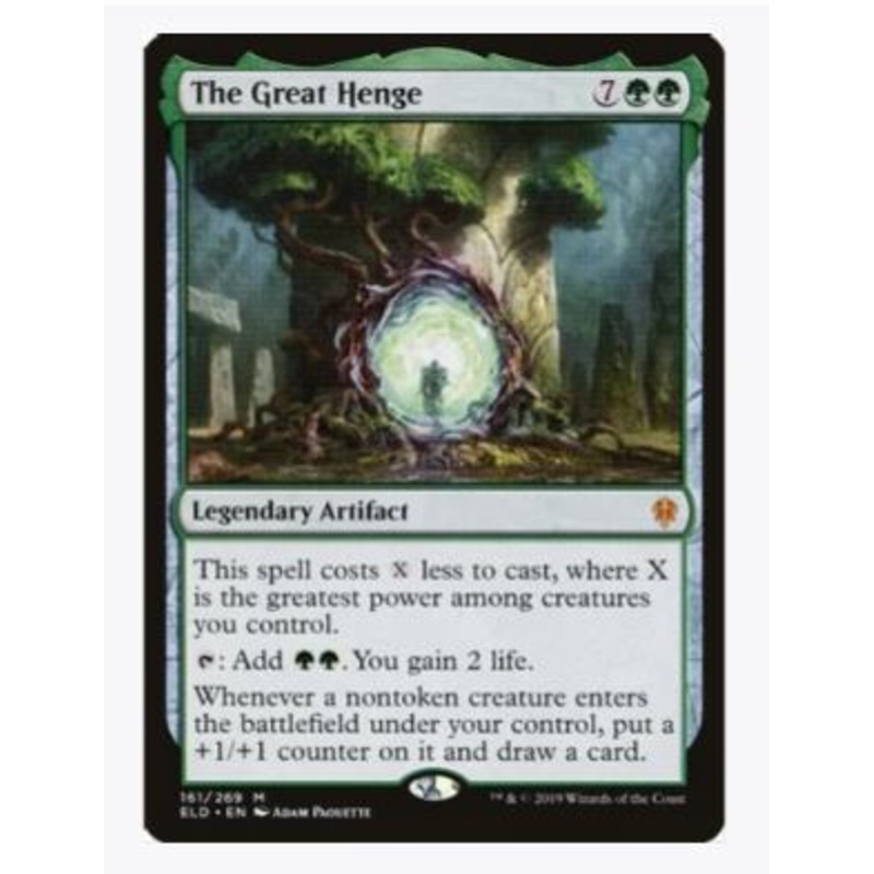 This spell costs X less to cast, where X is the greatest power among creatures you control.T: Add GG. You gain 2 life.Whenever a nontoken creature enters the battlefield under your control, put a +1/+1 counter on it and draw a card.Rarity:M#:161Card Type:L