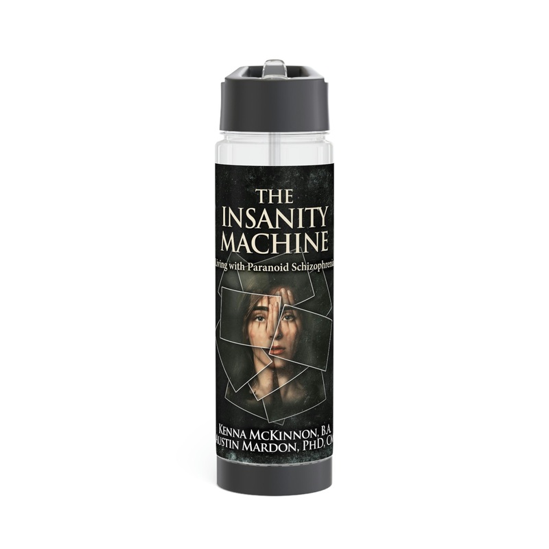 Add flavor and personality to your water with this infuser bottle. Twist the base off to access the infuser and add fruits, tea leaves, or anything you desire to enhance the flavor of your water. On the top, you’ll find a twist-on lid with a flip-top drinking sprout for a seamless drinking experience. This infuser is excellent for using at home, during outdoor excursions, or at the gym as a sports bottle. The cover art in this infuser water bottle is from Kenna McKinnon’s book, The Insanity Machine – Life with Paranoid Schizophrenia.