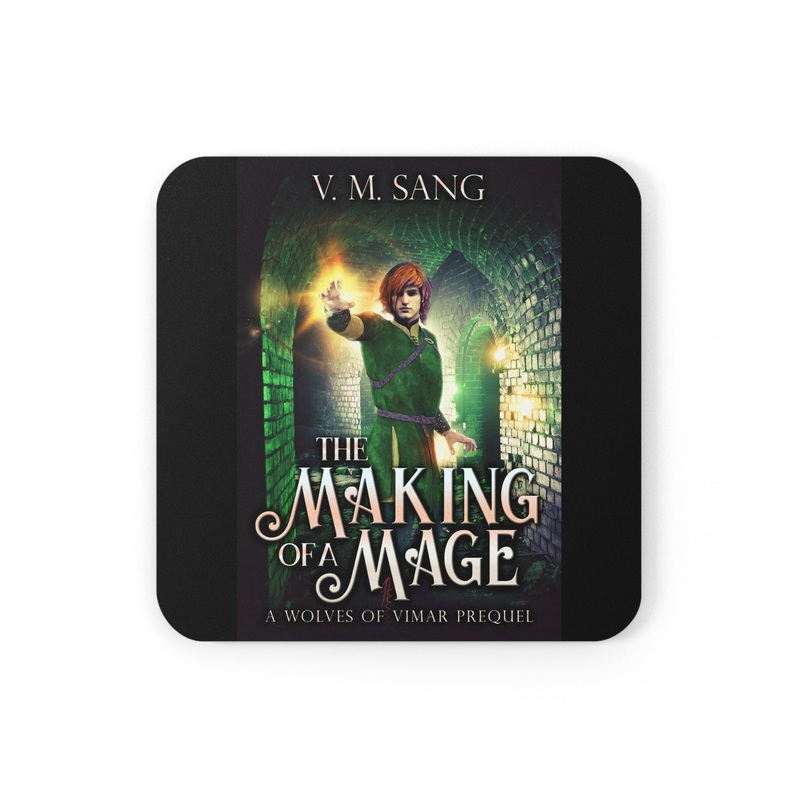 These coasters are made with a high-gloss top and feature a cork back to prevent sliding, and each order comes with a set of four coasters. The cover art in these coasters is from V.M. Sang's book, The Making Of A Mage.