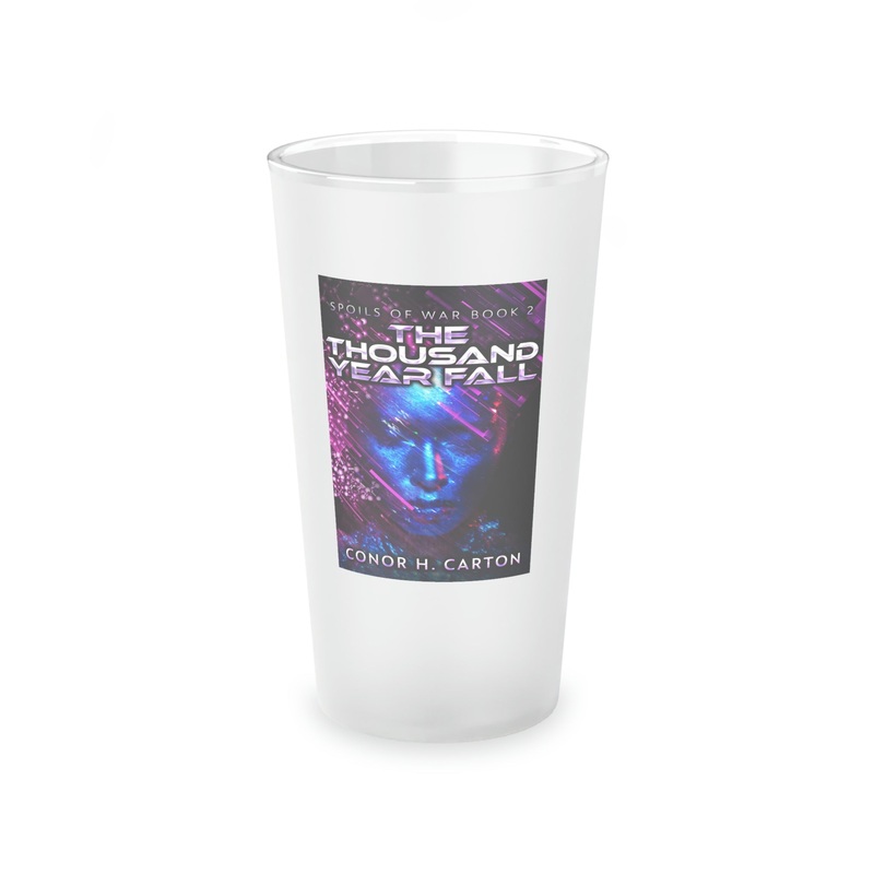 This frosted matte finish pint glass is versatile and dishwasher-safe. The cover art in this pint glass is from Conor H. Carton's book, The Thousand Year Fall.
