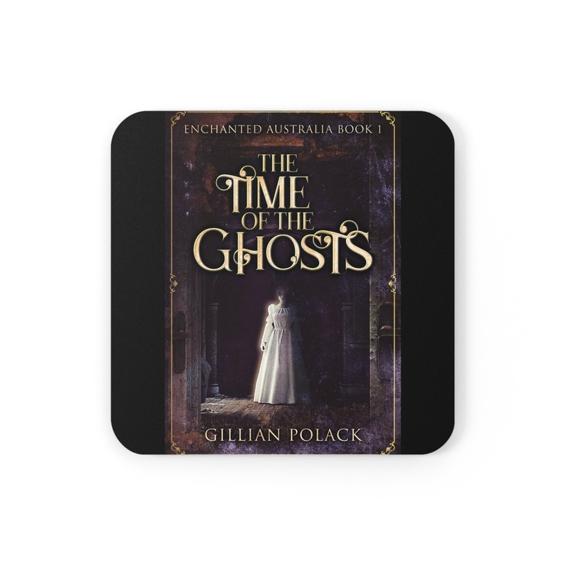 These coasters are made with a high-gloss top and feature a cork back to prevent sliding, and each order comes with a set of four coasters. The cover art in these coasters is from Gillian Polack’s book, The Time Of The Ghosts.