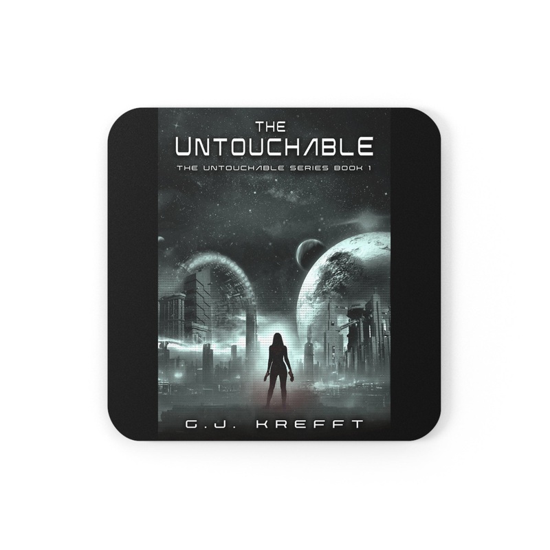 These coasters are made with a high-gloss top and feature a cork back to prevent sliding, and each order comes with a set of four coasters. The cover art in these coasters is from G.J. Krefft’s book, The Untouchable.