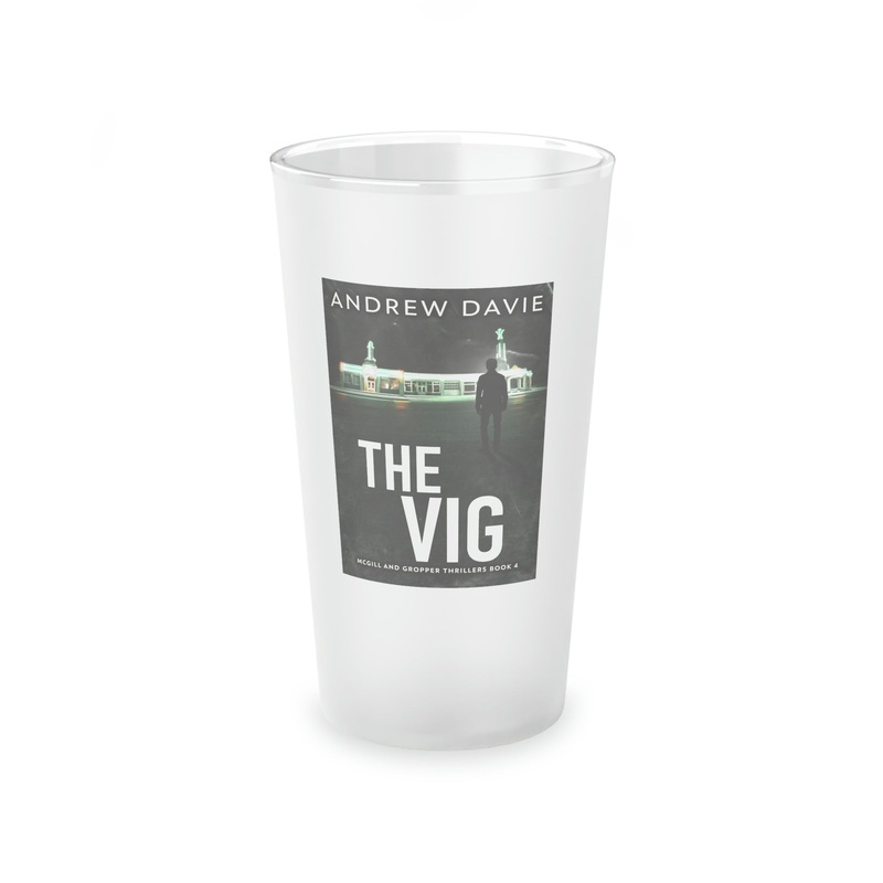 This frosted matte finish pint glass is versatile and dishwasher-safe. The cover art in this pint glass is from Andrew Davie’s book, The Vig.