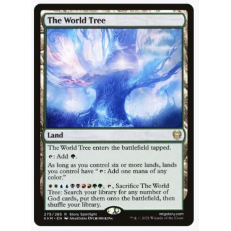 The World Tree enters the battlefield tapped.T: Add G.As long as you control six or more lands, lands you control have "T: Add one mana of any color."WWUUBBRRGG, T, Sacrifice The World Tree: Search your library for any number of God cards, put them onto th
