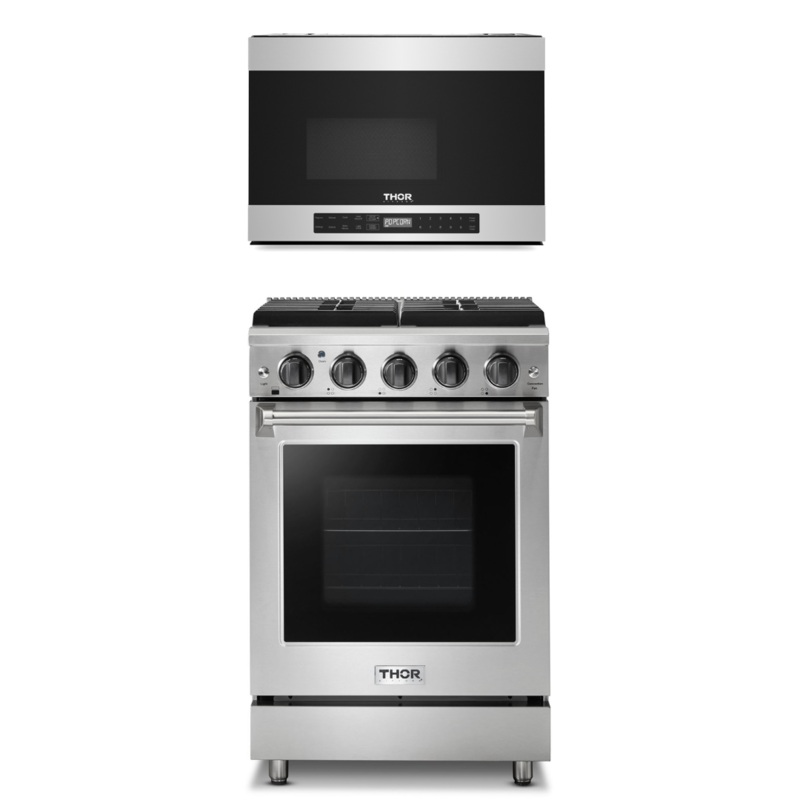 Upgrade your kitchen with this premium Thor Kitchen appliance package, featuring a powerful and sleek 24-inch stainless steel range and a quiet yet efficient 24-inch over-the-range microwave. Perfect for your kitchen remodel or new build, this professional