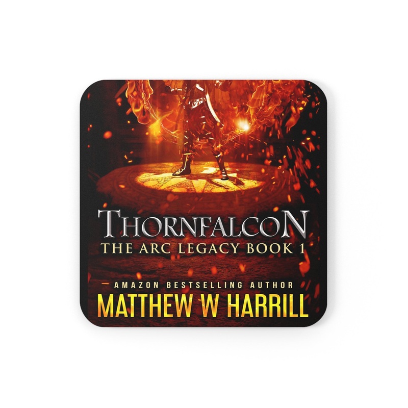 These coasters are made with a high-gloss top and feature a cork back to prevent sliding, and each order comes with a set of four coasters. The cover art in these coasters is from Matthew W. Harrill's book, Thornfalcon.