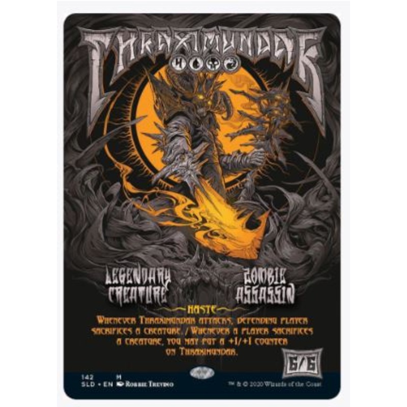 HasteWhenever Thraximundar attacks, defending player sacrifices a creature.Whenever a player sacrifices a creature, you may put a +1/+1 counter on Thraximundar.Rarity:R#:142Card Type:Legendary Creature Zombie AssassinP / T:6 / 6Casting Cost: 4UBR
