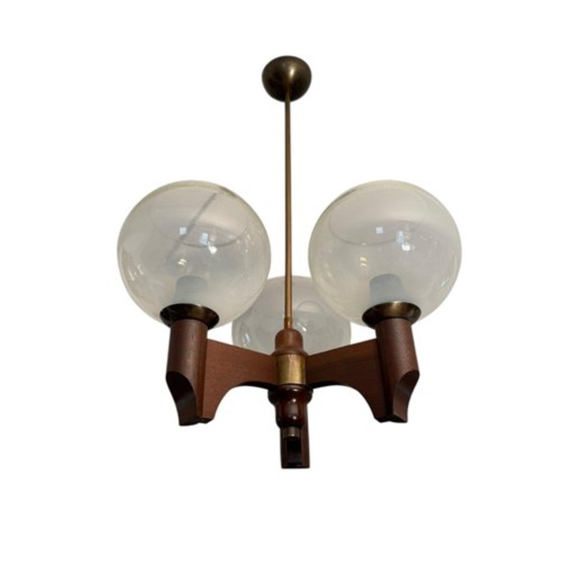 Mid-century Danish style three arms chandelier, Sijaj Hrastnik, Yugoslavia circa 1970. Solid mahogany body, brass parts, 3 opaline glass shades, e27 light sockets. Cleaned and mildly polished, refreshed in shellac, light wear consistent to age, patina. Des