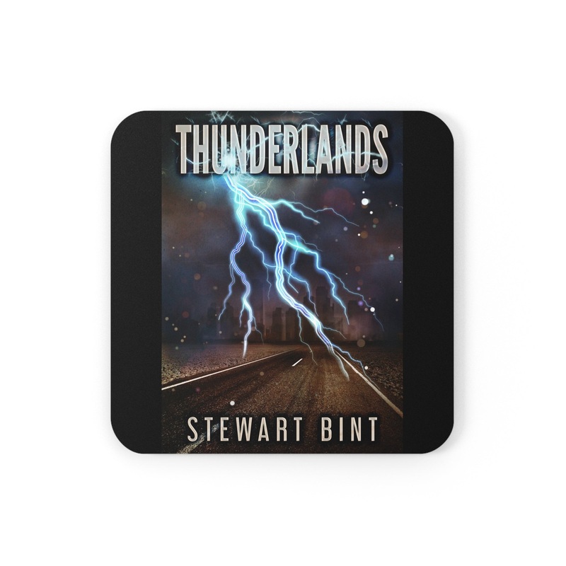 These coasters are made with a high-gloss top and feature a cork back to prevent sliding, and each order comes with a set of four coasters. The cover art in these coasters is from Stewart Bint’s book, Thunderlands.