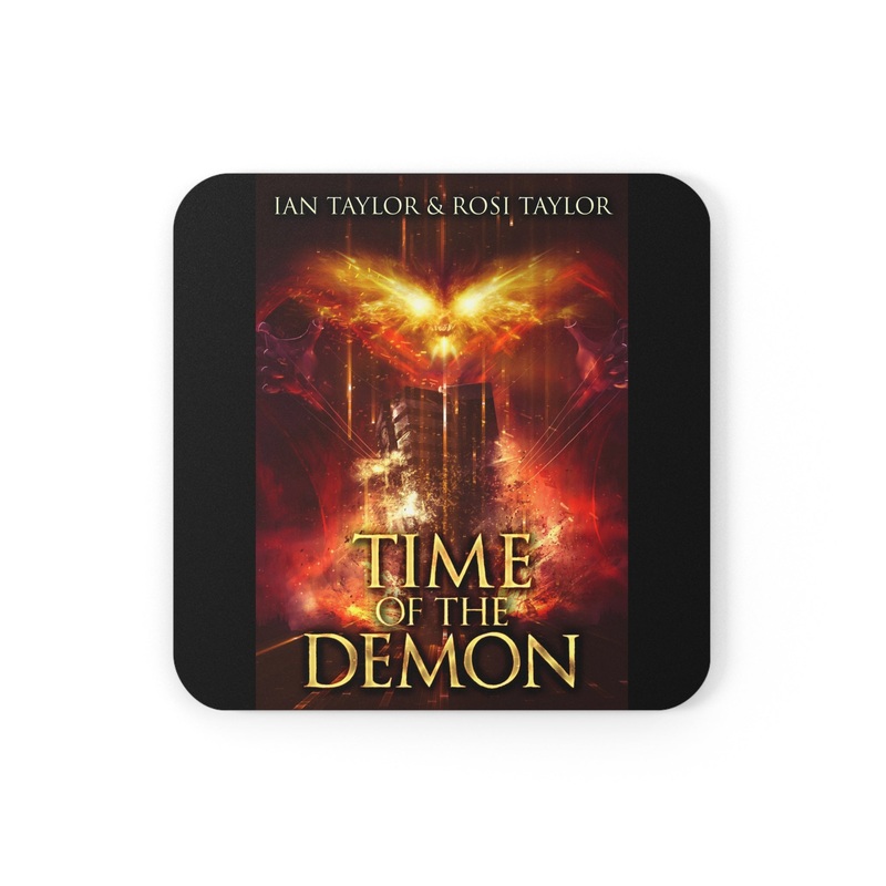These coasters are made with a high-gloss top and feature a cork back to prevent sliding, and each order comes with a set of four coasters. The cover art in these coasters is from Ian Taylor and Rosi Taylor’s book, Time Of The Demon.