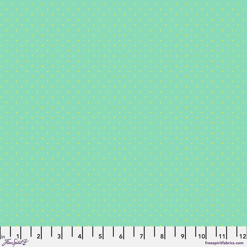 Tula Pink Tiny Dot in Peacock. Dot is a light yellow on a aqua background.44-45" wide100% cotton