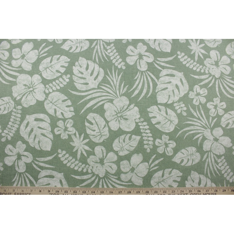 DESCRIPTION: Isle Be Back Fabric is a tropical silhouette print thatcombines the designs and textures taken from exotic species of island flora. Create your own island escape in your sunroom, patio or lawn. The fabric color registration shows white and four shades of green are used to create this island flora silhouette print.
