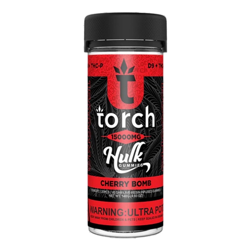 Indulge in the explosive flavor and effects of Torch Hulk Cherry Bomb Gummies! Each resealable jar contains 15,000mg of Delta 9 and THC-P infused with Live Resin, providing fast-acting and potent relief. With 20 gummies per jar and 750mg per gummy, these delicious treats pack a punch. Let the cherry bomb ignite your senses.
