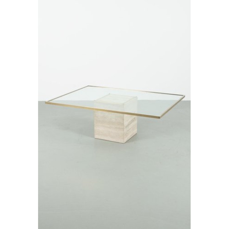 Roger Vanhevel travertine coffee table, made in Belgium. Stunning chique table with heavy glass top with brass trim. In good vintage condition with some acceptable signs of wear. Measurements L. 120 cm; W. 86 cm; H. 42 cm.