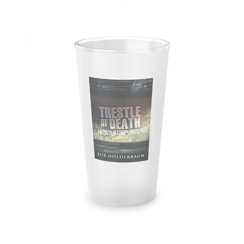 This frosted matte finish pint glass is versatile and dishwasher-safe. The cover art in this pint glass is from Bob Holderbaum's book, Trestle Of Death.