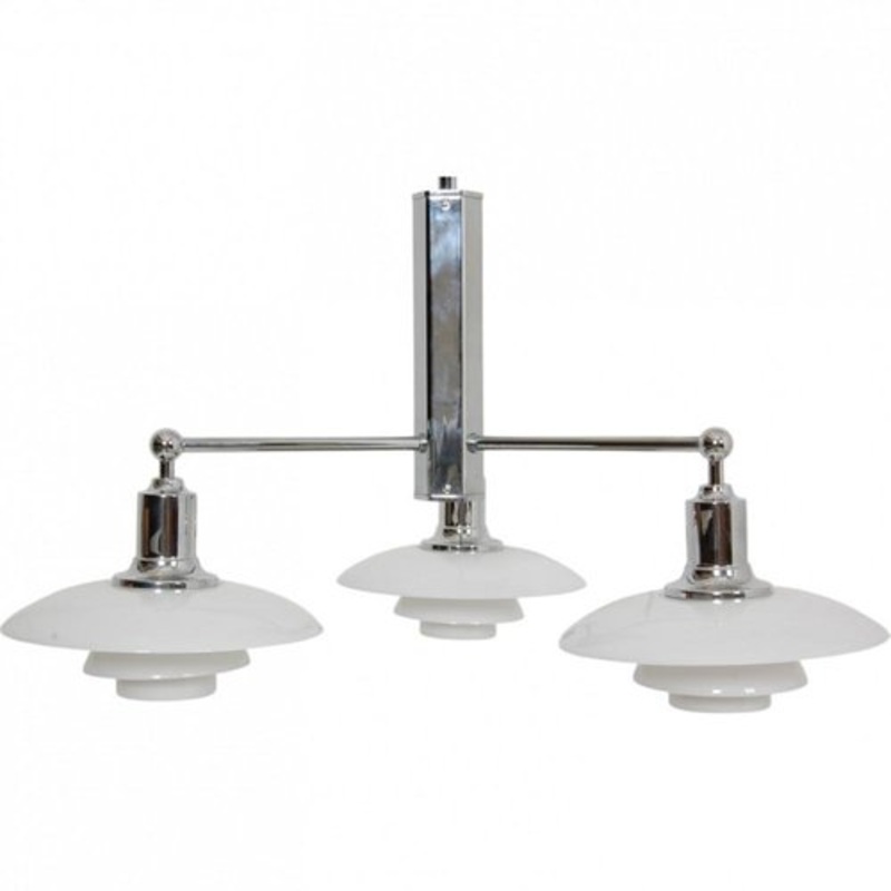 Designer: Poul Henningsen Manufacturer: Louis Poulsen Production year: Around 2013 Model: Stammekrone Dimensions: Height: 65 / Diameter: 60 Cm Materials: Chrome frame and shades of white opal glass Condition: Second-hand Poul Henningsen Stammekrone chandelier from around 2013.