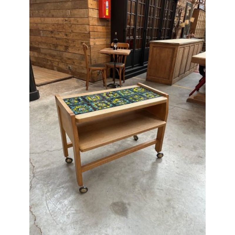 Serving table on wheels in Guillerme and Chambron oak produced by Vos Maison in the 1960s. The upper top is decorated with 10 ceramic tiles made by Boleslaw DANIKOWSKI. Lower shelf height 43 cm Decorative and practical!!!!