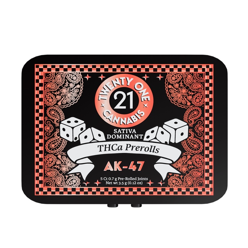 5 of Twenty One Cannabis THC-A Pre-Rolls Includes 5 Pre Rolls .7 Grams per Pre Roll 3.5 Grams per tin 3 strains to choose from Sealable Tin Description Indulge in the ultimate experience with Twenty One THC-A Pre-rolls. This pack includes 5 pre-rolls, each