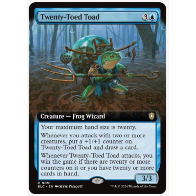 Your maximum hand size is twenty.Whenever you attack with two or more creatures, put a +1/+1 counter on Twenty-Toed Toad and draw a card.Whenever Twenty-Toed Toad attacks, you win the game if there are twenty or more counters on it or you have twenty or mo