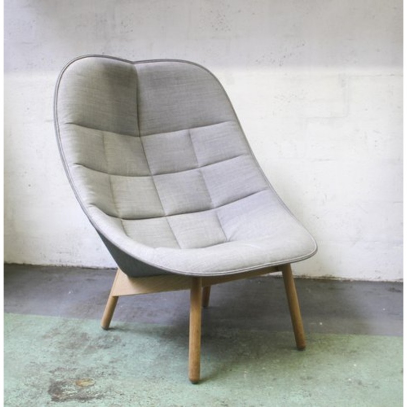 Uchiwa Quilt design armchair by Hay.Clear wood base and padded and padded back in gray fabric.Its shell shape offers optimal comfort.Assisi height 40cm.Perfect for all your workspaces or even living rooms. Manufacturer Hay Design Period From 2000 Productio