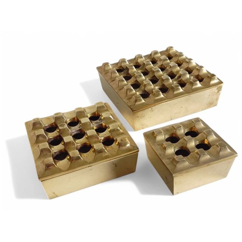 Beck & Jung Ultima 15 set of three ashtrays, a striking example of Post-Modern design by Swedish duo Holger Bckstrm and Bo Ljungberg. Made from bronze with clean, geometric lines, they reflect the bold, unconventional aesthetic of the era. Produced in Denm