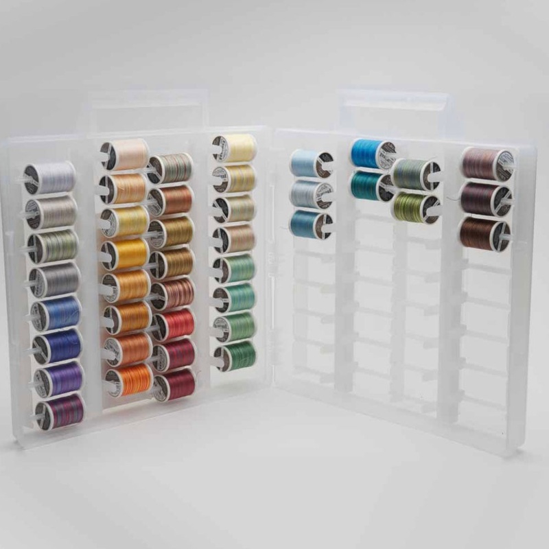 All 42 of the Newest Sulky 12 wt. Cotton Blendables colours on the 330 yd. Snap Spool within the clear Universal Slimline storage box that can conveniently hold up to 64 large and small snap-end spools and weighs only 6 lbs when full.