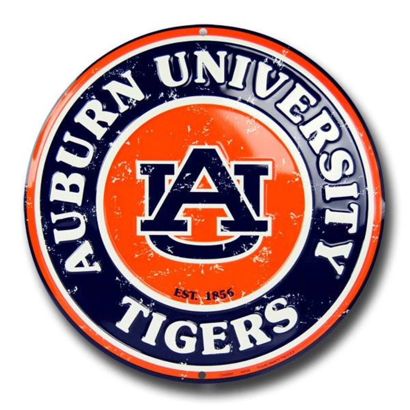Officially licensed 12" University of Auburn Collegiate Embossed Metal Circular Sign. This sign has a worn/vintage look. Made of high quality aluminum for a weather resistant finish. It is lightweight & durable. Pre-drilled holes for quick and easy mountin