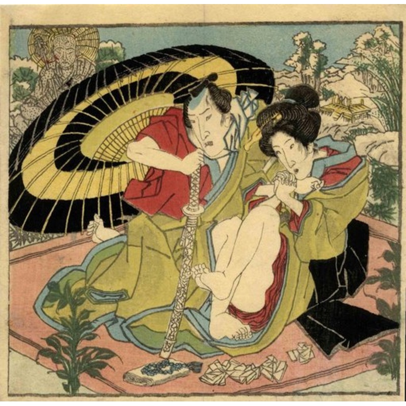 Shunga is an original artwork realized in the 1850s by Utagawa Kunisada (1786-1865). Making love in the winter on a terrace, behind the couple stone sculpture of the Jizo-Bosatsu. Very good impression, backed, centrefold. Passepartout is included. Utagawa Kunisada, also known as Utagawa Toyokuni III (1786 – 1865) was one of the most famous designers of Ukiyo-e woodblock prints from Japan in the 19th century. Burn Sumita Sogoro, at the age of 15-16 years became a part of the Utagawa Toyokuni family and in 1844 he took the male of the master Toyokuni.