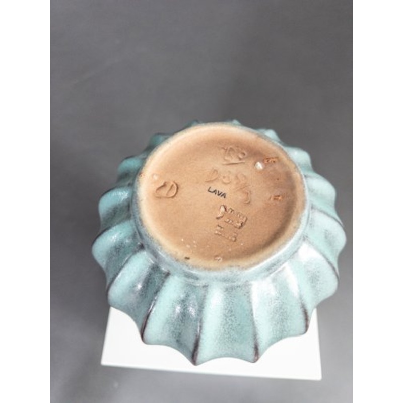 This elegant vase, designed by Ewald Dahlskog, is a fine example of Swedish ceramic artistry from the 1930s. Produced by Bo Fajans, it belongs to the Lava series, characterized by its organic, fluted form and striking glaze. The vase features a soft blue-green glaze with dark accents that emphasize its ribbed texture, creating a visually dynamic surface. The sculptural shape, with its flaring neck and rounded body, reflects the Art Deco influences of the period. The markings on the base authenticate its origin, confirming its place in Swedish design history. A beautiful and collectible piece, this vase showcases Dahlskogs mastery of both form and finish.