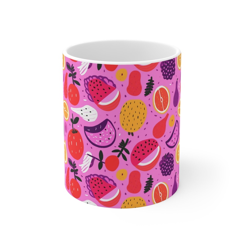 Keywords: fruit coffee mug, endless pattern mug, colorful fruit design, ceramic coffee cup, unique mug gift, kitchen decor, trendy drinkware, eco-friendly mug, fruity pattern, vibrant colors
