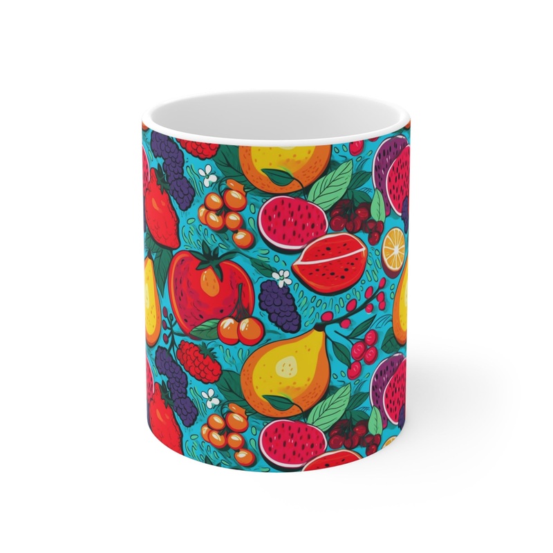 Keywords: fruit coffee mug, endless pattern mug, colorful fruit design, ceramic coffee cup, unique mug gift, kitchen decor, trendy drinkware, eco-friendly mug, fruity pattern, vibrant colors