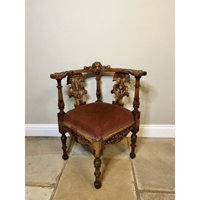 Antique Victorian quality carved walnut Italian corner chair having a quality carved solid walnut shaped back with a cherub to the centre griffins and dragons pierced carved splats, turned carved column supports, a drop in seat, shaped carved solid walnut