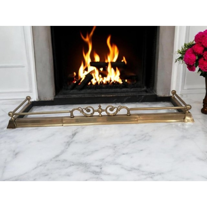 A rare and distinguished find, this Victorian-era extendable brass fireplace fender embodies the refinement and craftsmanship of the 19th century. Exceptionally well-made and substantial in weight, it showcases an elegant Art Nouveau-inspired central panel
