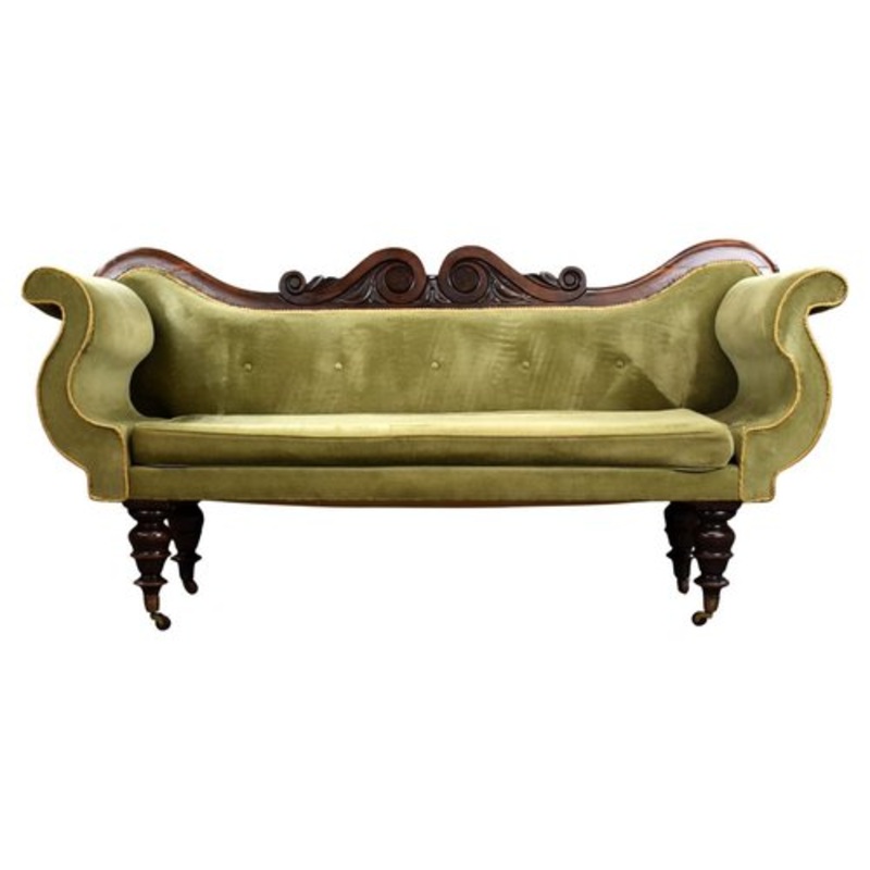 For sale is a good quality Victorian mahogany sofa, having a carved back and scroll arms, raised on turned legs terminating on castors, this piece remains structurally sound and in good order, though it would benefit from re-upholstery. Width: 200cm Depth: 61cm Height: 97cm