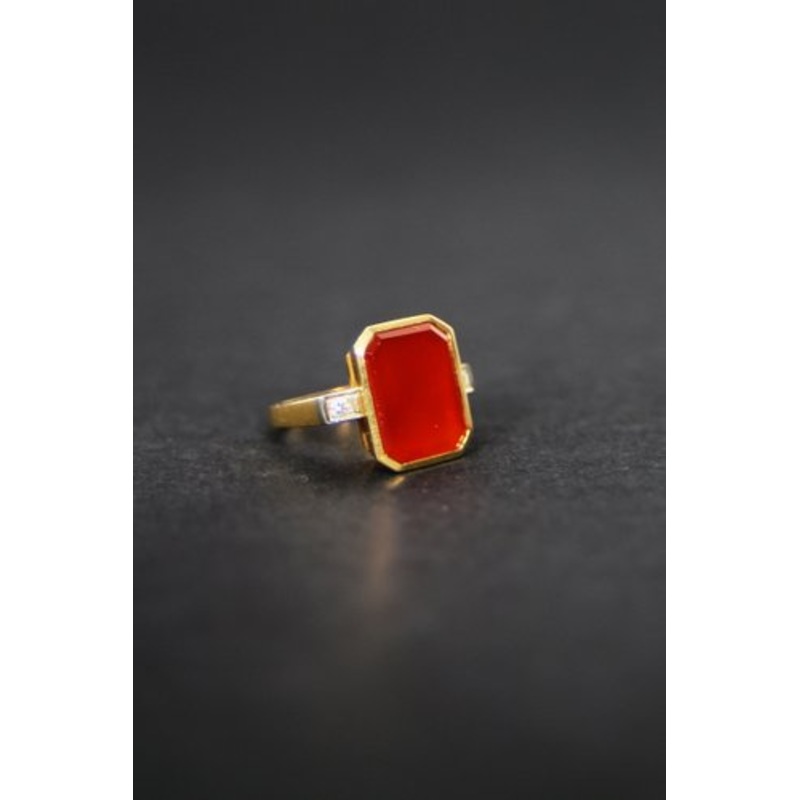 Vintage 18K gold ring with a central carnelian stone, flanked by two side diamonds. Origin: Italy. Hallmarked.