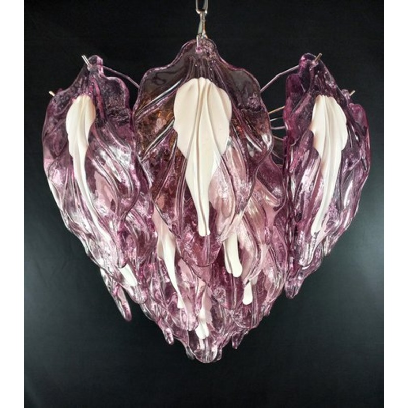 Vintage Murano chandelier, Mazzega style. Round in shape, suitable for any environment. This chandelier is made up of n. 25 Murano glass leaves, handmade, in amethyst colored crystal, with a milky white core. The vintage style chandelier has very special l