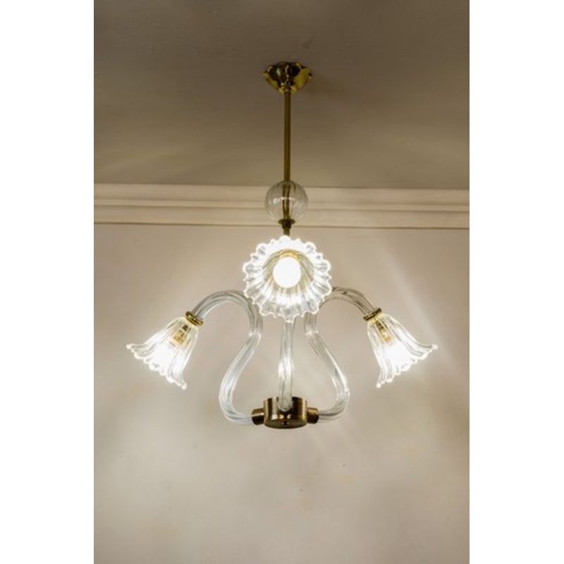 Elegant vintage chandelier, made in the 1930s in the Barovier and Toso Murano glass factories. The hand-blown transparent glass structure, characterized by fluid and sinuous lines, reflects the craftsmanship typical of the Murano tradition. The brass finishes and flower-shaped lampshades combine harmoniously, giving the chandelier a unique and timeless character.