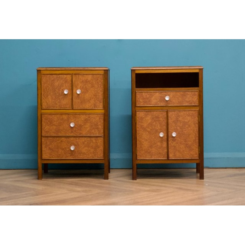 Abeautiful quality vintage pair of teak and walnut effect formica bedside tablesOne has a cupboard and two drawers, the other has a cupboard, a drawer and compartment Design Period 1950 to 1959 Year Production Period 1950 to 1959 Country of Manufacture Uni