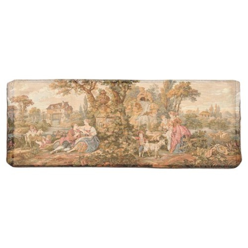 Very pretty mid century French tapestry with nice galant design titled Repos Fontaine (Fontain Rest) and beautiful colors, woven with mechanical Jaquar looms with wool, acrylic and cotton. The Repos Fontaine tapestry is one of those that mark a major styli