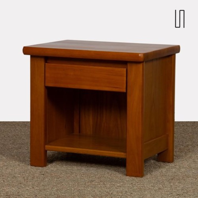 Vintage bedside table in solid elm, 1980s Reference : D1448 This vintage bedside table is in solid elm. It was made in France in the 1980s. It opens with a front drawer. This bedside table is in good original condition. Height 44 cm Width 47 cm Depth 36 cm Period 1980’s Country of origin France Condition Vintage Material Elm