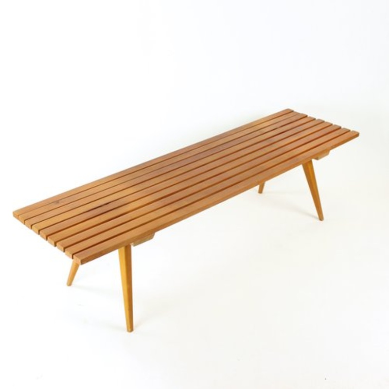 Beautiful vintage wooden bench in an original condition. Produced in Czechoslovakia, this bench is low in style. Ideal for occassional seating, or as a plant holder, or interior design piece. Stands on four legs in oak. Beautiful, elegant lines. Original finish. Some minor use wear visible on the wooden pieces. This only adds to the charm of the piece and makes it interesting. Very elegant piece.