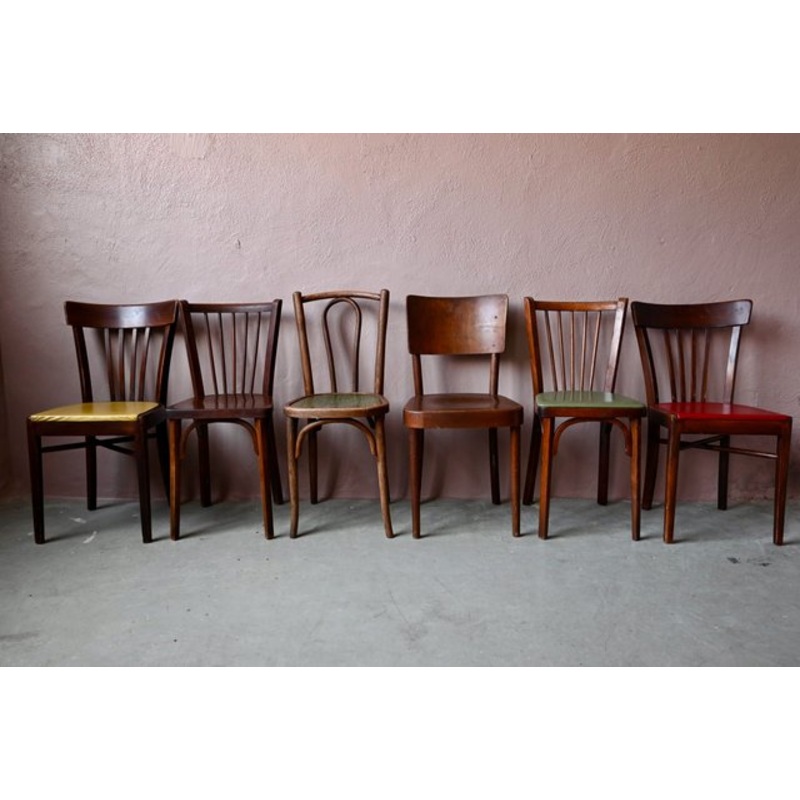 This series of 6 mismatched bistro-style chairs is dark in color. The patina is pronounced and the chairs show significant traces of use, visible in the photo. The series includes 3 Baumann chairs and a Horgen Glarus. Bistro chairs are stable, the wood is healthy, they are comfortable. There are no tears on the leatherette.