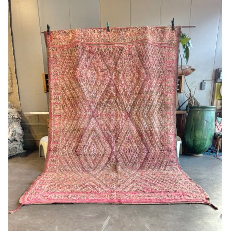 This stunning vintage Boujaad Berber rug, measuring 200×315 cm, is an authentic handwoven masterpiece from the Middle Atlas Mountains in Morocco. Boujaad rugs are known for their rich history, intricate geometric patterns, and warm, naturally faded tones, making them sought-after pieces in interior design.